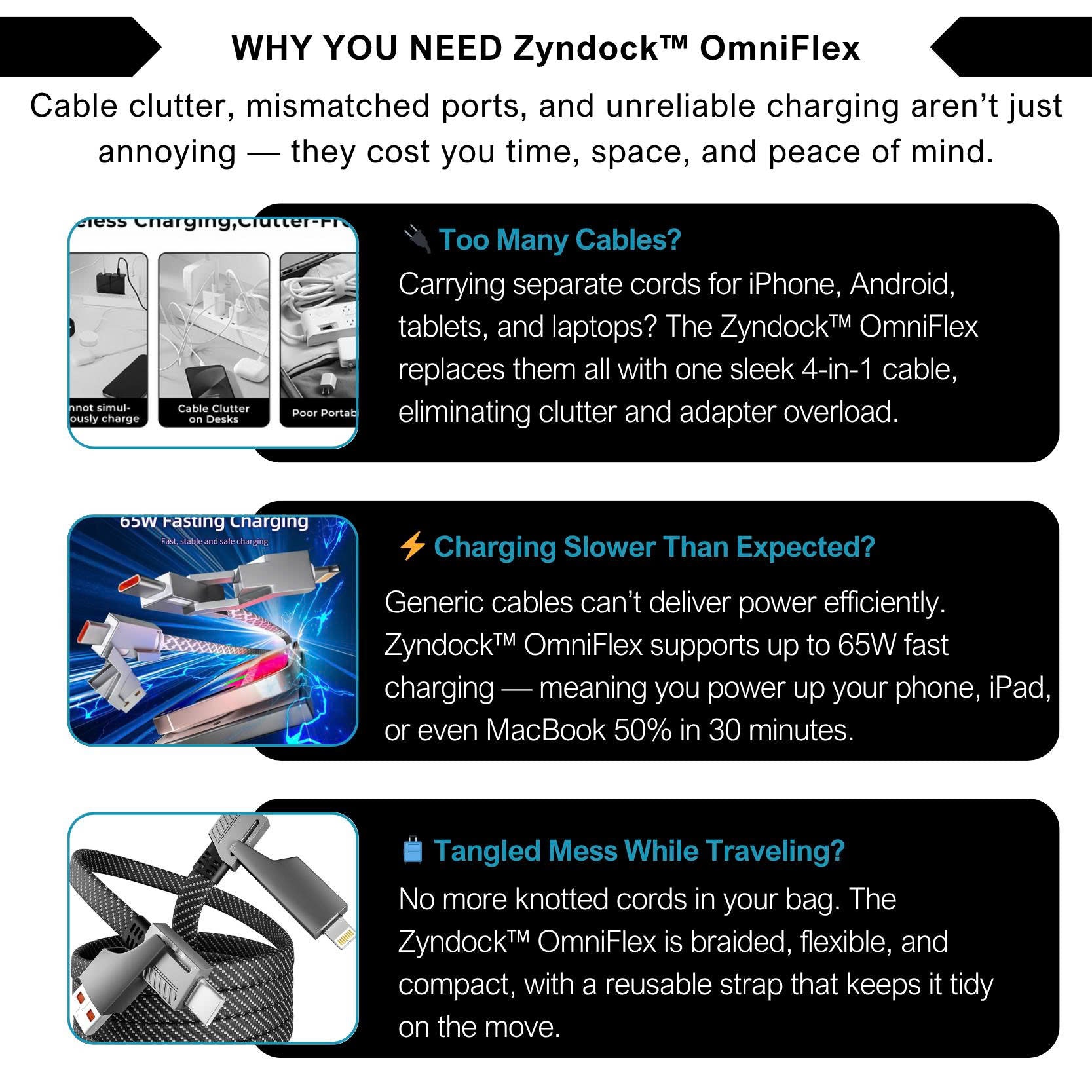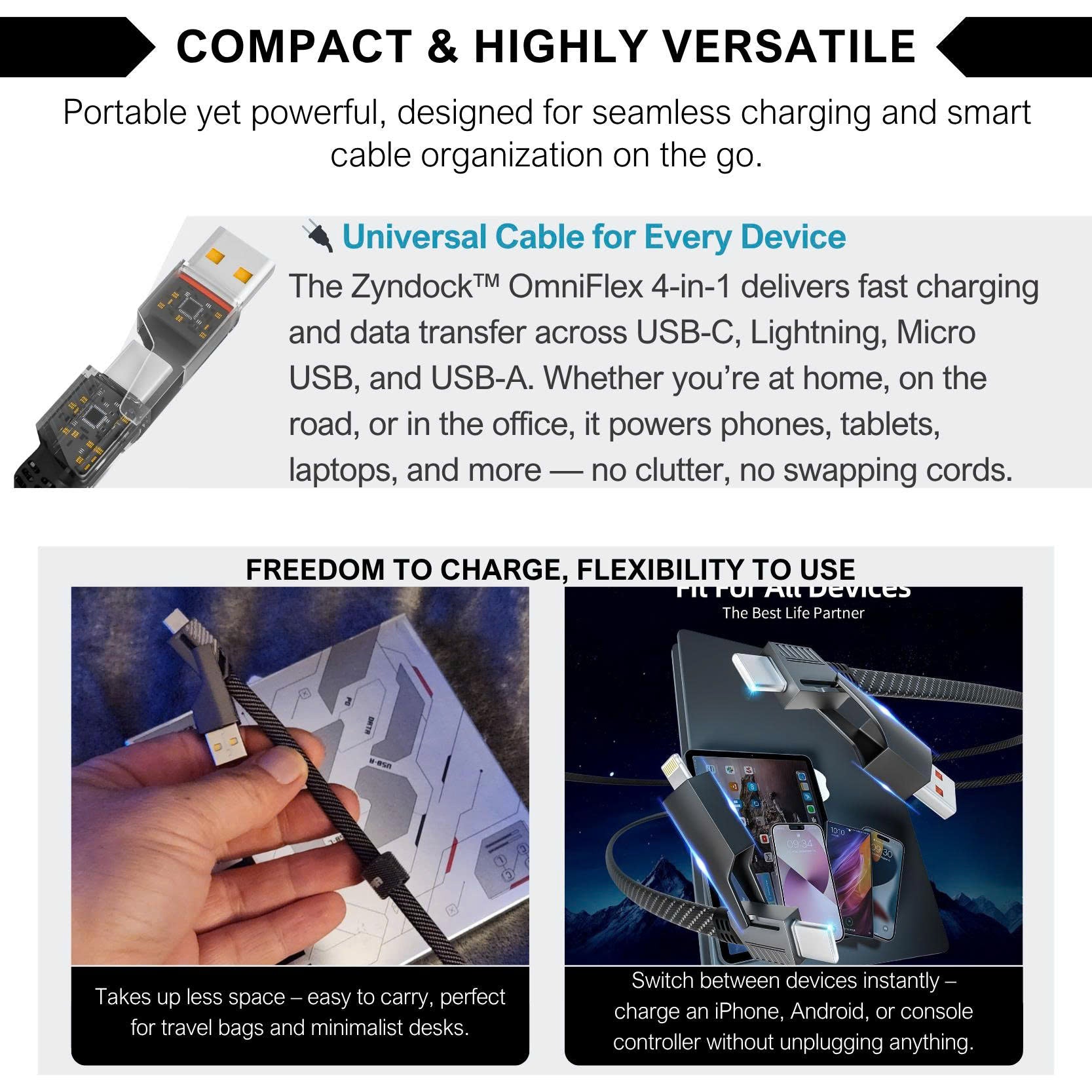 • I bought the Zyndock™ OmniFlex on a whim because my family uses iPhones, Androids, and random tablets. It’s been a game-changer. One cable charges everything – even in the car with Apple CarPlay! I keep one by my bed and another in my backpack. Feels super durable and the fast charging is legit. Worth every dollar.