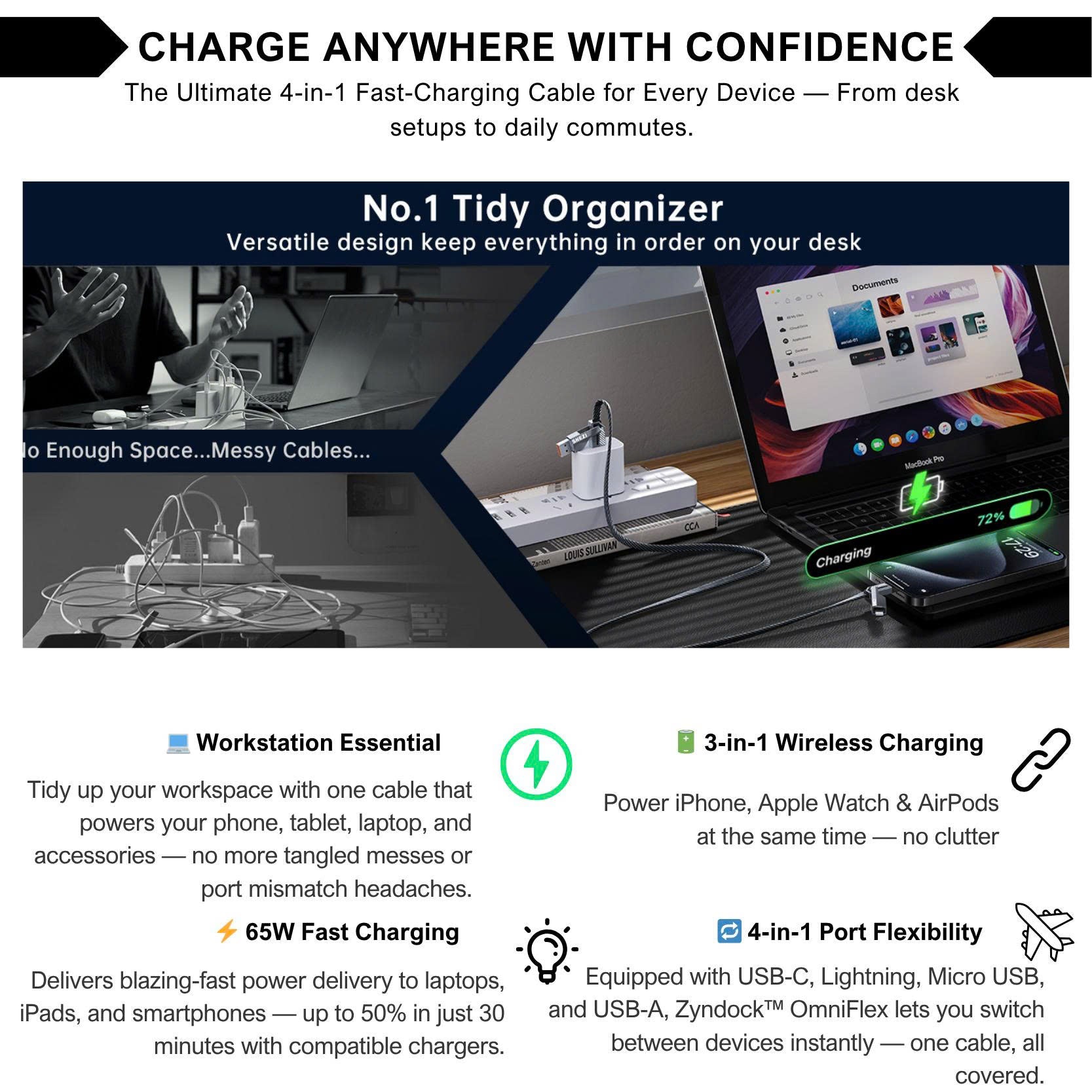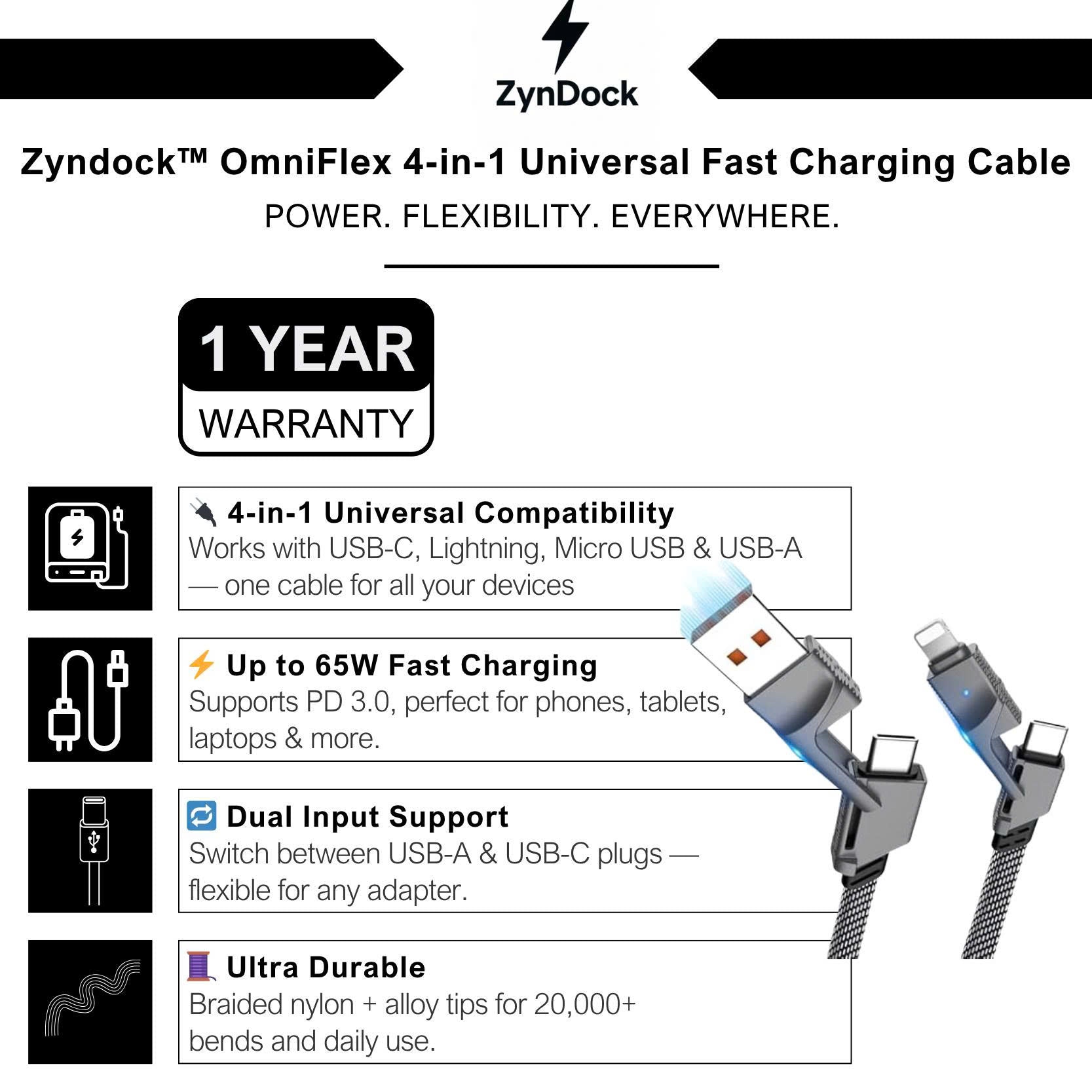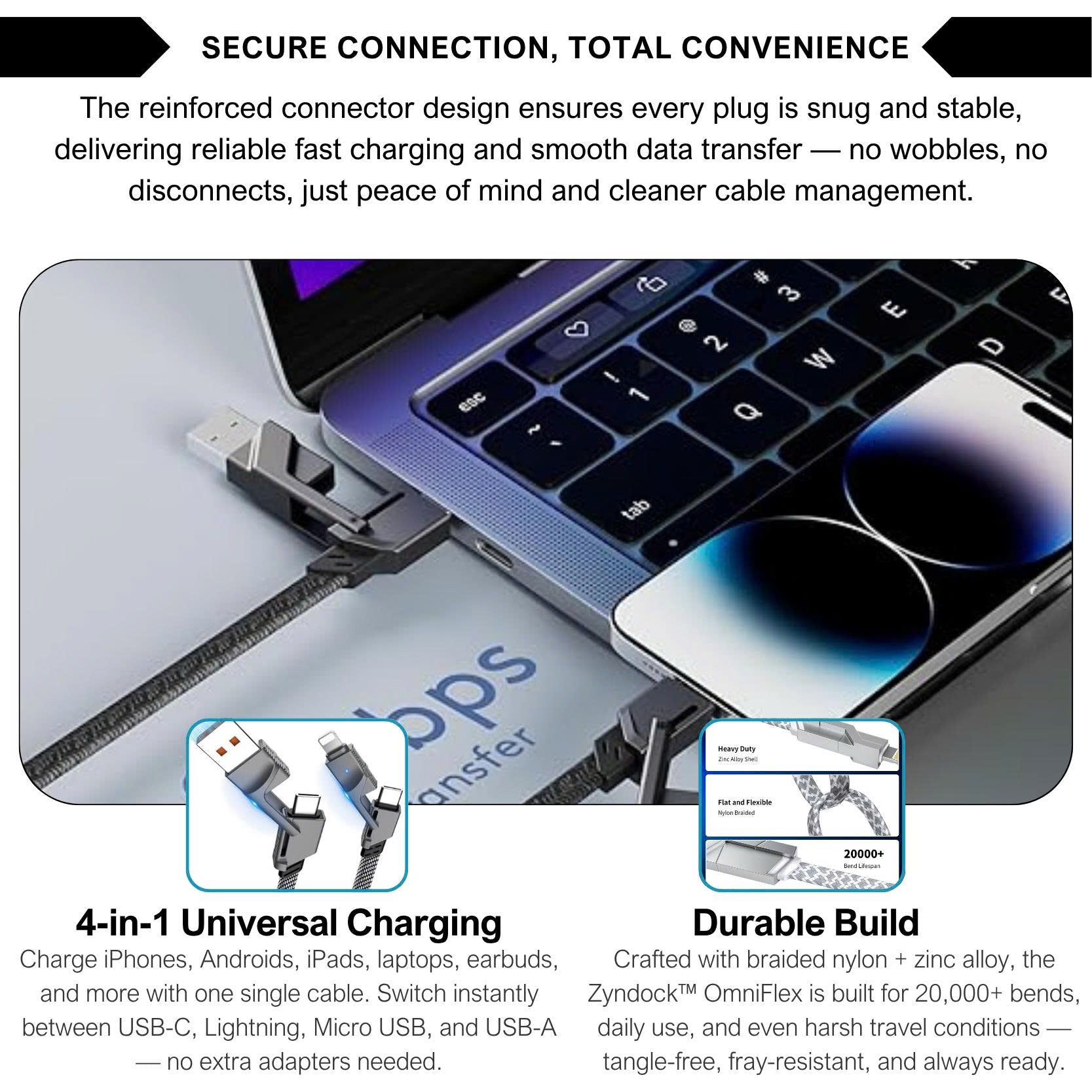 After months of real-world use and thousands of happy customers, the Zyndock™ OmniFlex has emerged as the go-to 4-in-1 charging solution for tech-savvy users worldwide. From smartphones and tablets to laptops and wireless accessories, it delivers ultra-reliable 65W fast charging, seamless CarPlay and Android Auto support, and data transfer up to 480Mbps — all wrapped in a braided, zinc-alloy reinforced body built to last 20,000+ bends. With its sleek versatility and rock-solid performance, Zyndock™ OmniFlex is redefining what a universal charging cable should be.