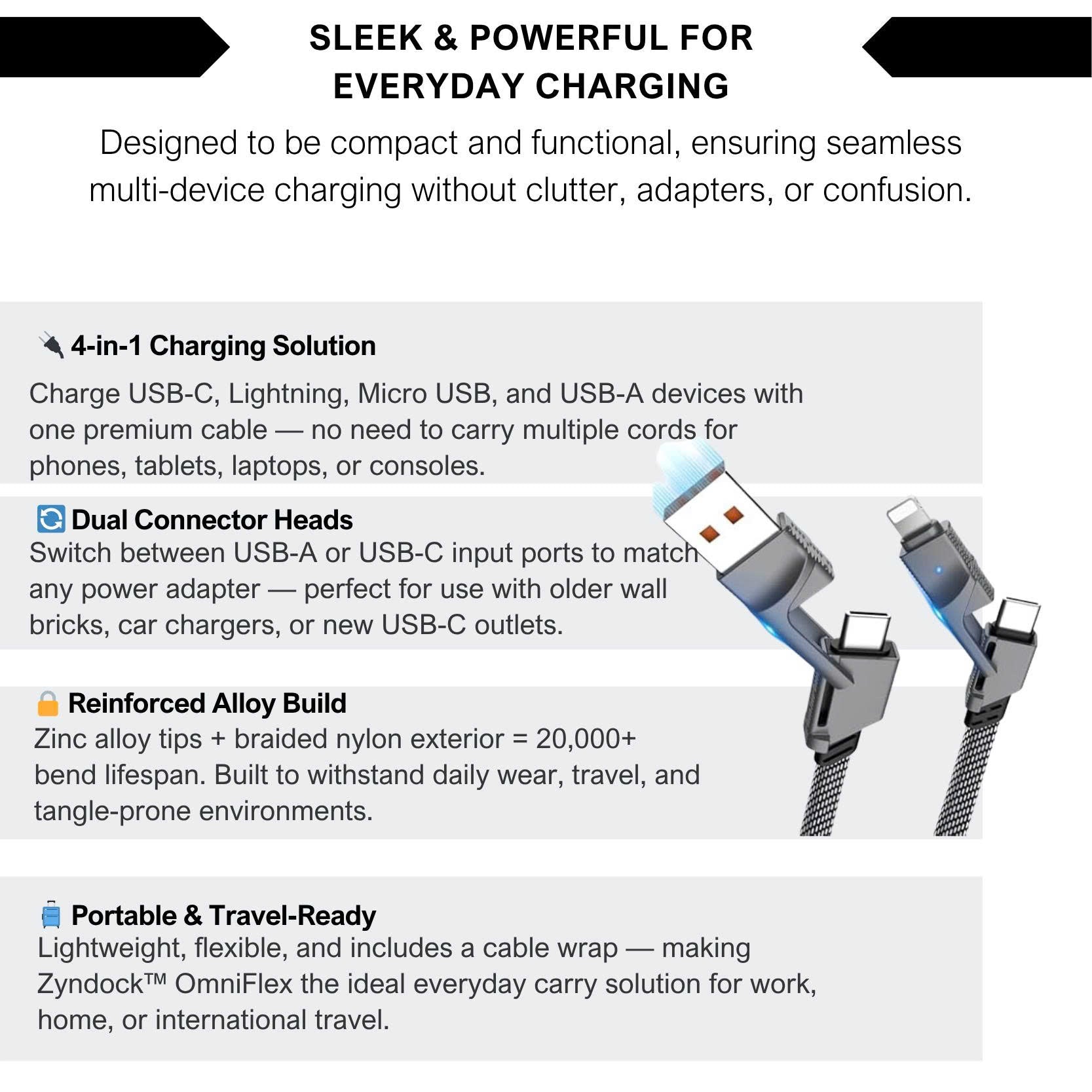 Definitely. The Zyndock™ OmniFlex is built with premium zinc alloy heads and braided nylon, tested for 20,000+ bends. It’s made to survive daily use, travel, and life’s unexpected drops — unlike cheap cables that fray in weeks.
