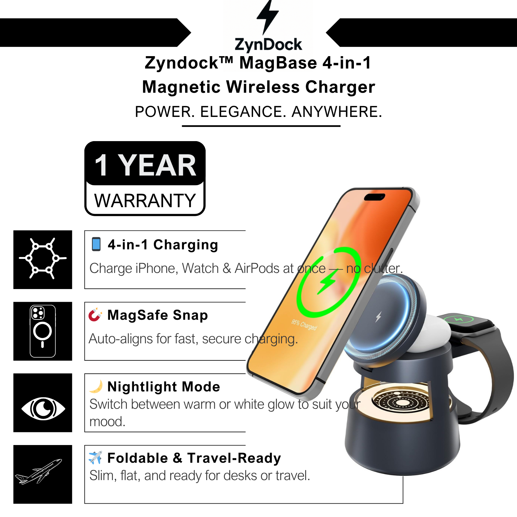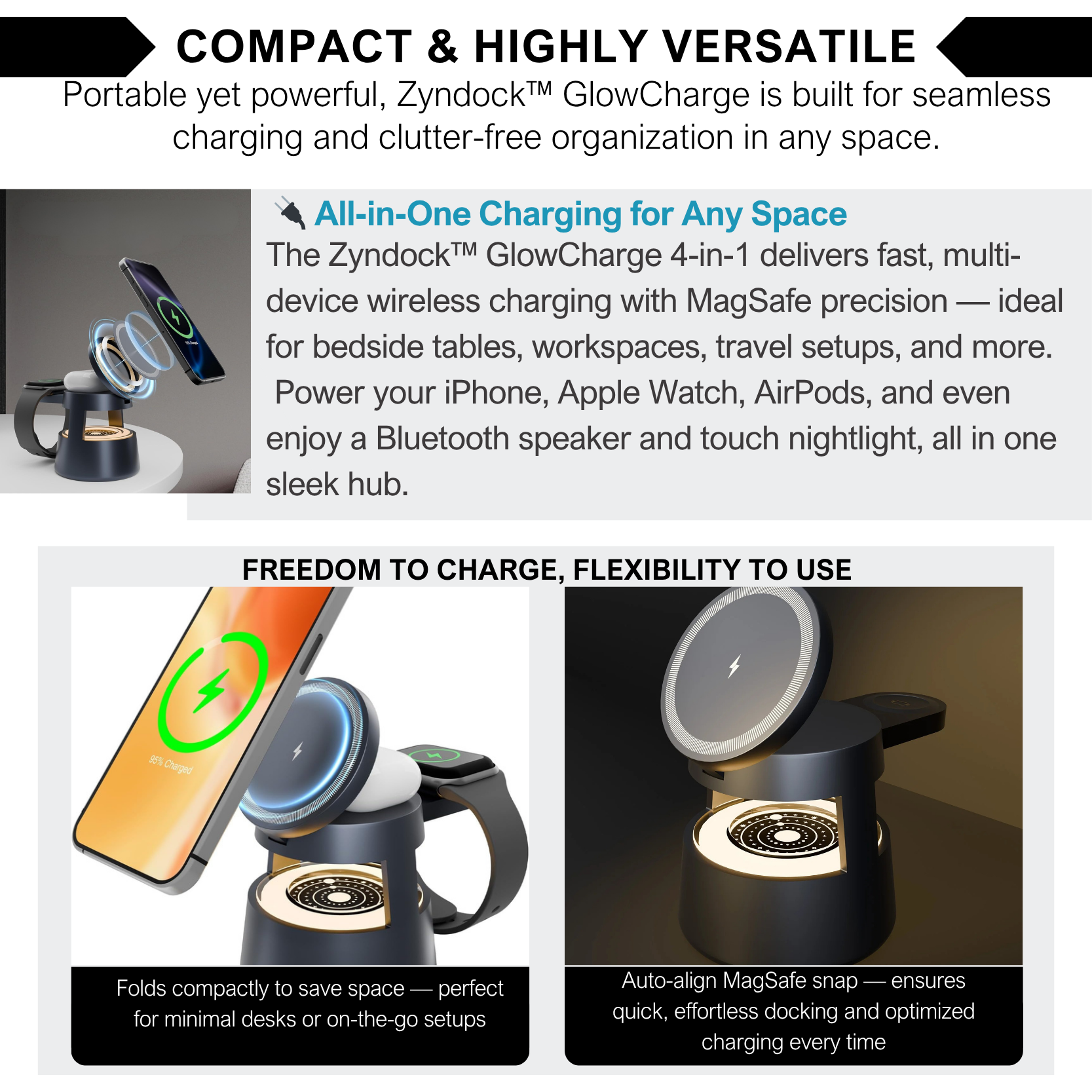 Whether at home, the office, or on the go, Zyndock™ GlowCharge brings together MagSafe precision, a soothing nightlight, and a built-in Bluetooth speaker, all in one compact hub.