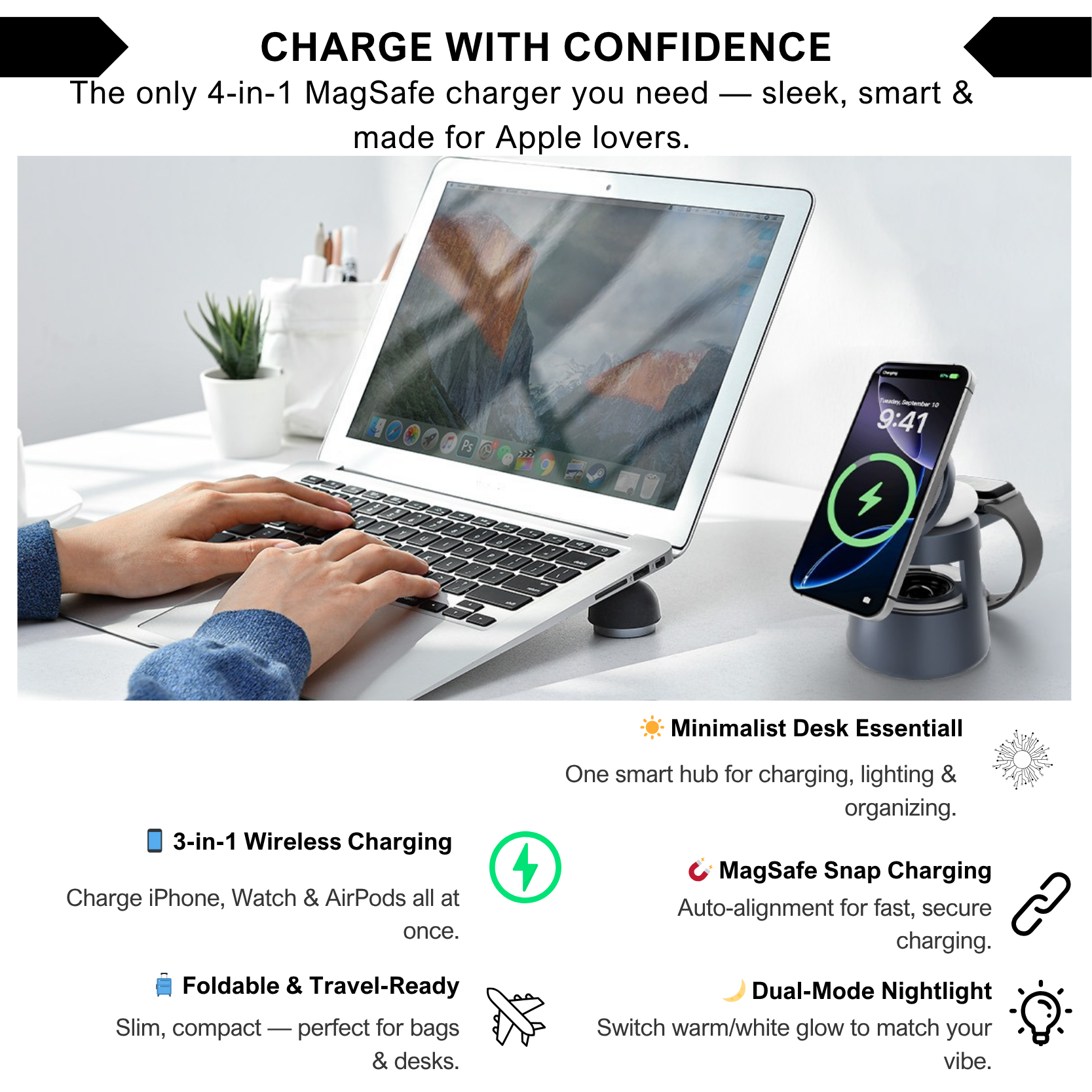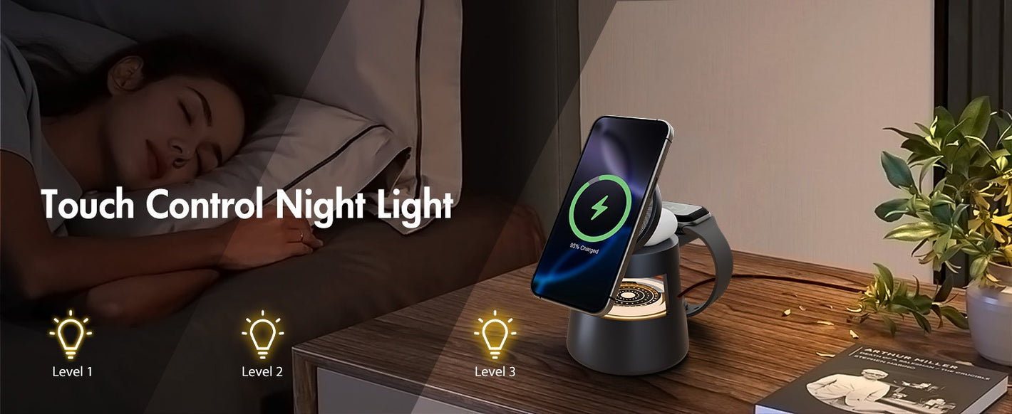 From bedside nightstands to business travel setups, users love the added value of a built-in Bluetooth speaker, a three-level touch nightlight, and truly wireless freedom — all in one compact foldable dock.